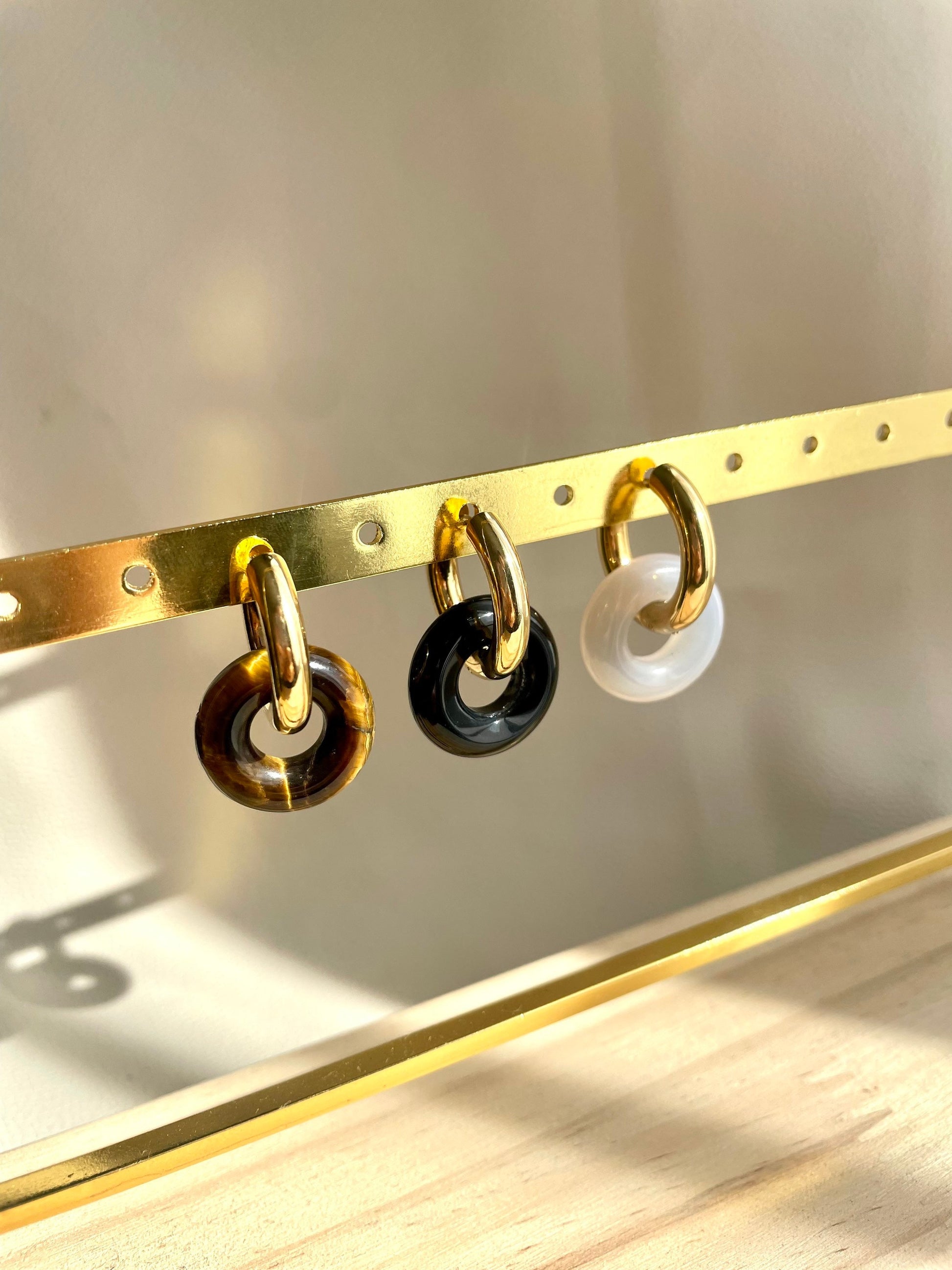 Pendentif en pierre naturelle œil du tigre (marron), quartz fumé (transparent) et onyx (noir)